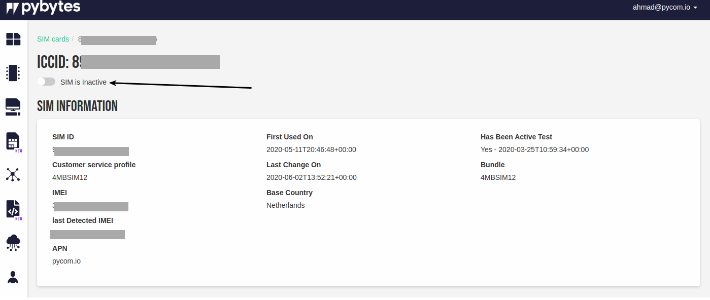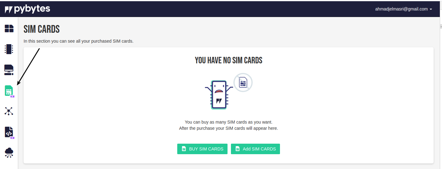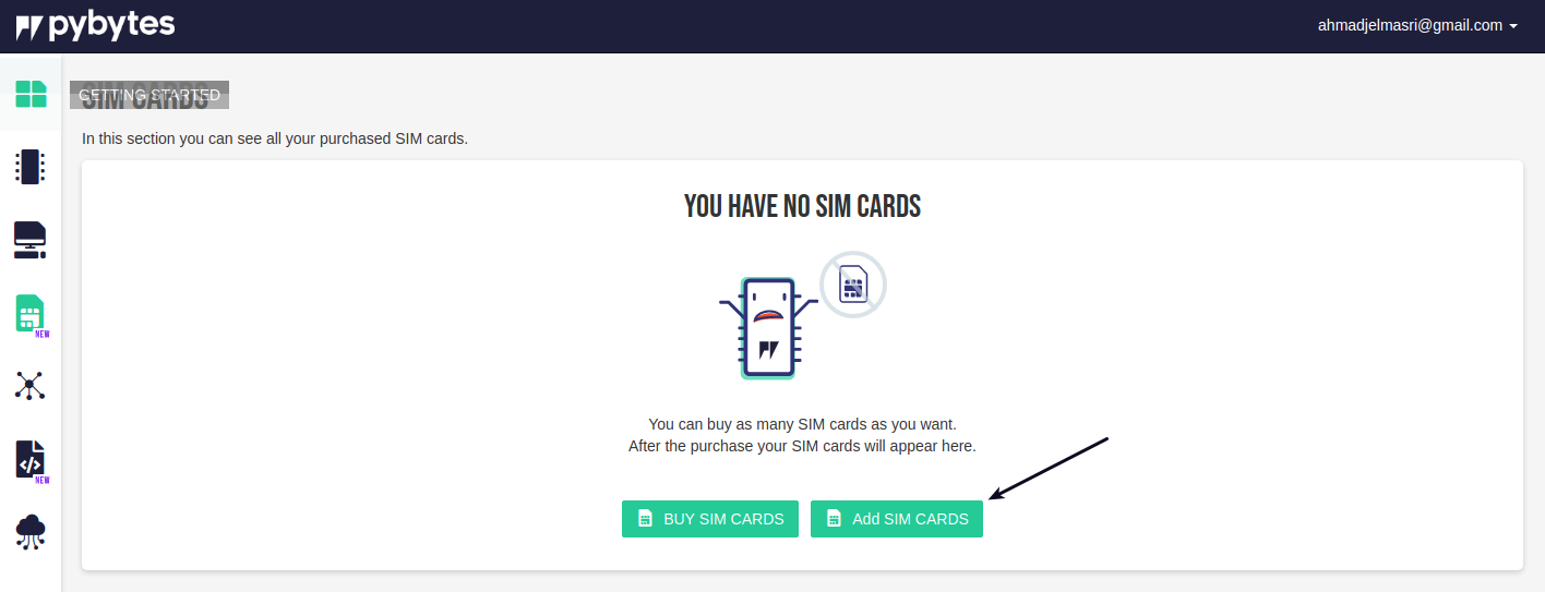 • When all sim cards are linked to your Pybytes account you can see them listed under Sim cards section.