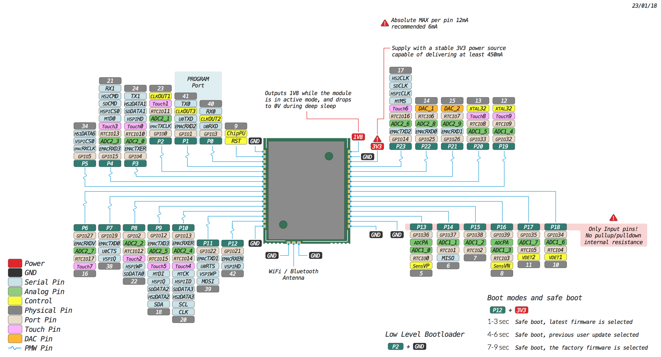 Please note that the PIN assignments for UART1 (TX1/RX1), SPI (CLK, MOSI, MISO) and I2C (SDA, SCL) are defaults and can be changed via software.