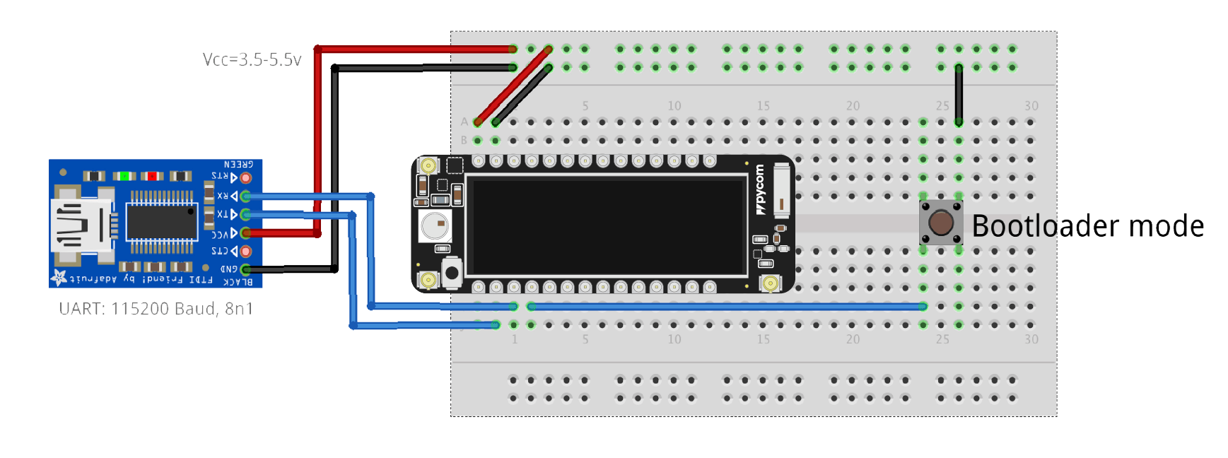 When you do not own an expansion board, it is possible to connect to your device using a USB to Serial adapter. Make sure your USB to Serial converter is able to communicate at baudrates of 115200 and 921600. We do not recommend this setup for beginners.