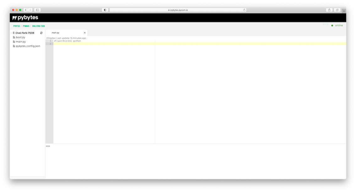 Pymakr Online is an online IDE for your MicroPython projects. We brought our Pymakr Plugin for Atom and Visual Studio code into Pybytes as an IDE, so you won’t necessarily need to have those code editors installed anymore in order to work with your Pycom devices.