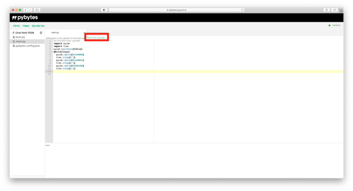 1. After adding the code, a Save and Upload button will appear (or you can use the Save/Export button already present), allowing you to upload code to the device. Clicking this will upload and reboot the device. The device will restart and go offline for a second. Then come back online and show the RGB LED blinking in three different colors.