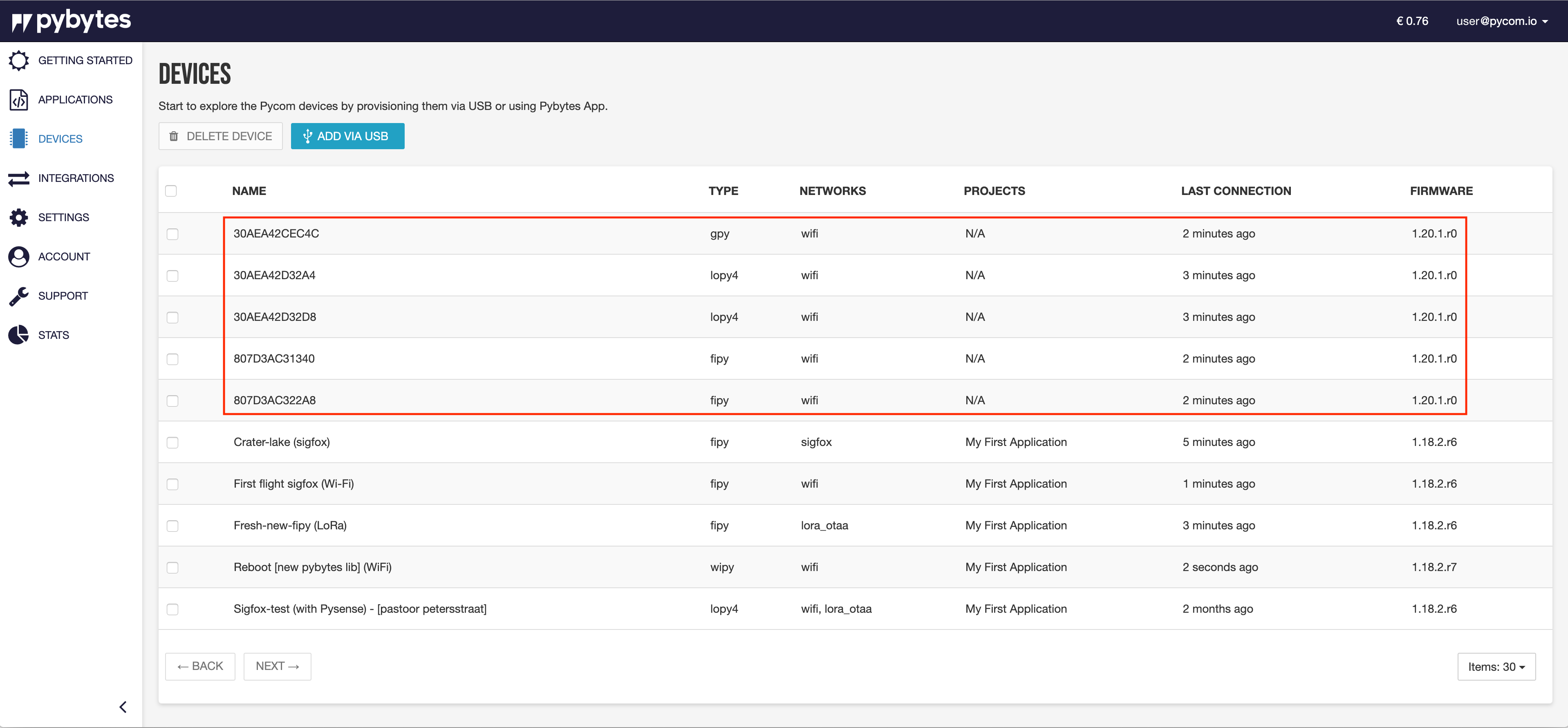 1. As your devices are provisioning in Pybytes devices management platform, you will see notifications appearing on the screen when the provisioning is successful. You will also see the provisioned devices in the Devices section.