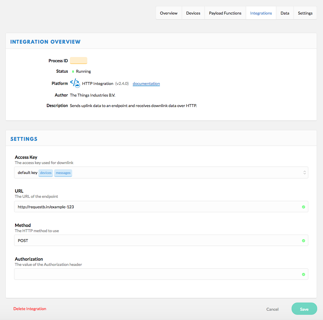 For this example, use the HTTP Integration to forward the LoRaWAN Packets to a remote server/address.