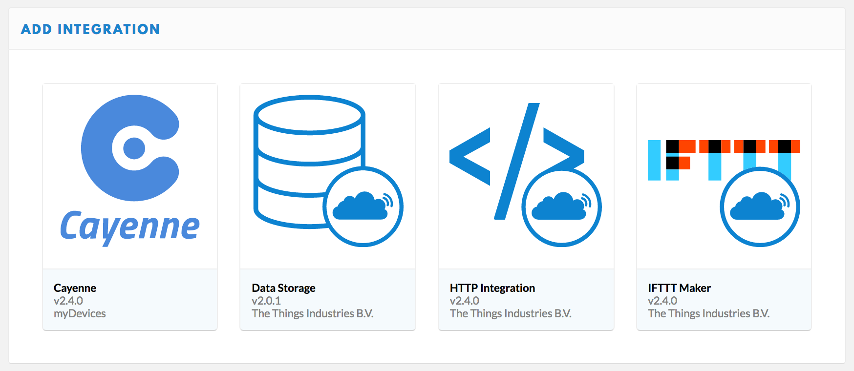 Upon clicking add integration, a screen with 4 different options will appear. These have various functionality and more information about them can be found on the TTN website/documentation.